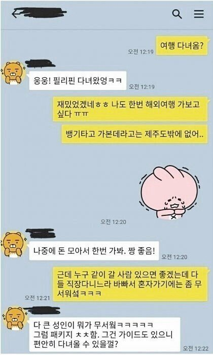 남성은 “여행 다녀옴?”이라 물으며 대화를 시작한다.