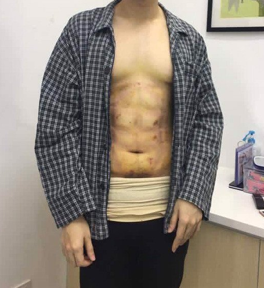 그는 복부 지방을 제거하고 식스팩 모양의 근육을 만들었다. 수술 직후 배에는 식스팩 모양으로 반창고가 붙여져 있다. 아직 근육이 자리잡기 전이라 곳곳에는 수술 흉터와 피멍이 남아있다.