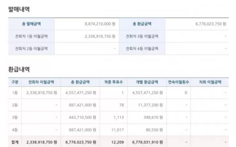 이번 회차 상금은 22억 1900만원인데, 저번 회차에 1등 당첨자가 나오지 않아 이월된 23억 3800만원까지 더해 어마어마한 상금을 얻게 된 것이다.