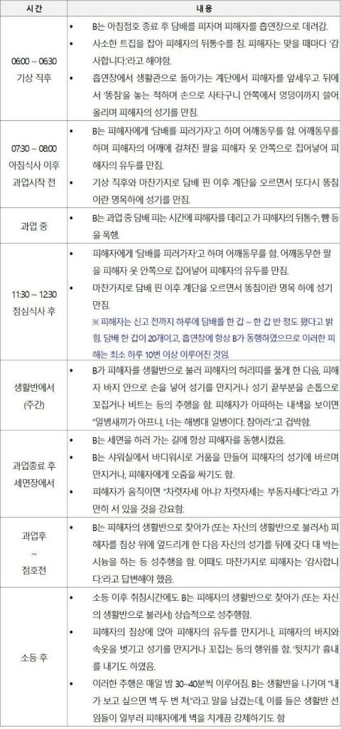 피해자가 겪은 피해 사실을 재구성한 일과표이다. 군인권센터가 제작한 내용이다.