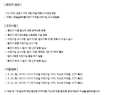 그런데 공개된 동선에 따르면 22일부터 발열 증상과 인후통을 느낀 어린이집 교사는 어린이집에 출근을 했다.