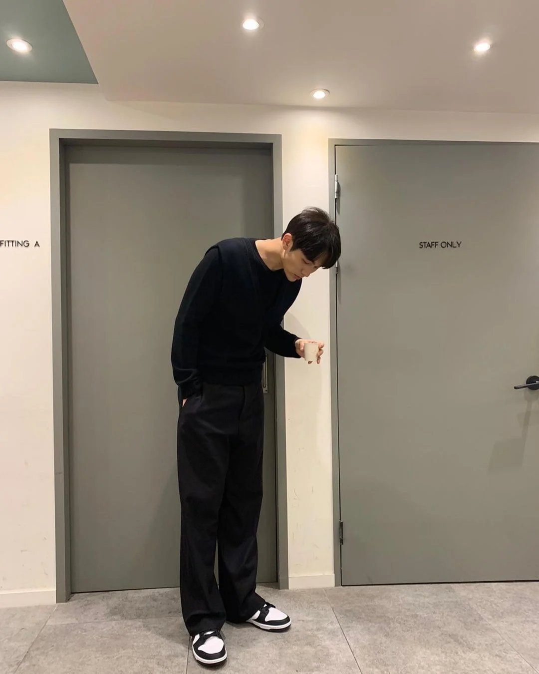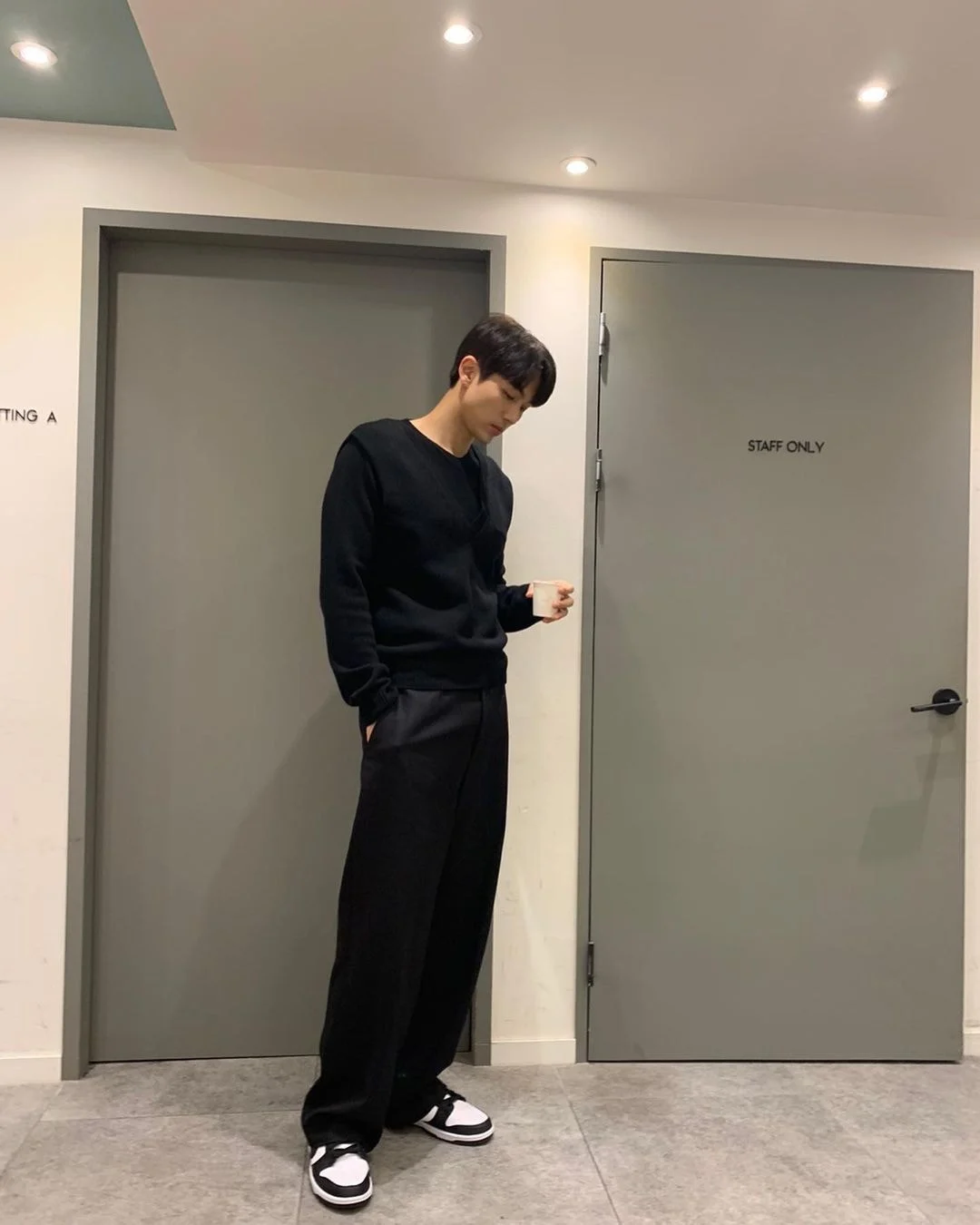 올블랙 옷을 입고 손에는 종이컵을 들고 있는 편안한 모습이었다.