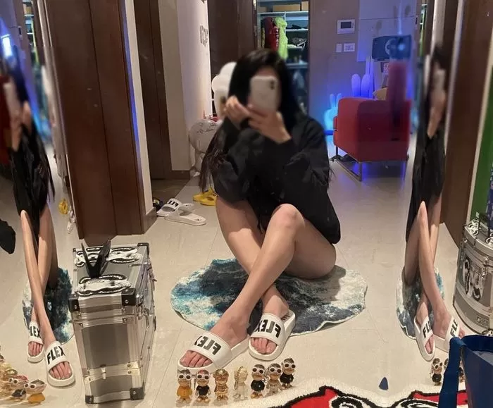 여성은 휴대폰으로 얼굴 대부분을 가리고 있었으며, 염따의 굿즈인 상의와 실내화를 착용하고 있었다.