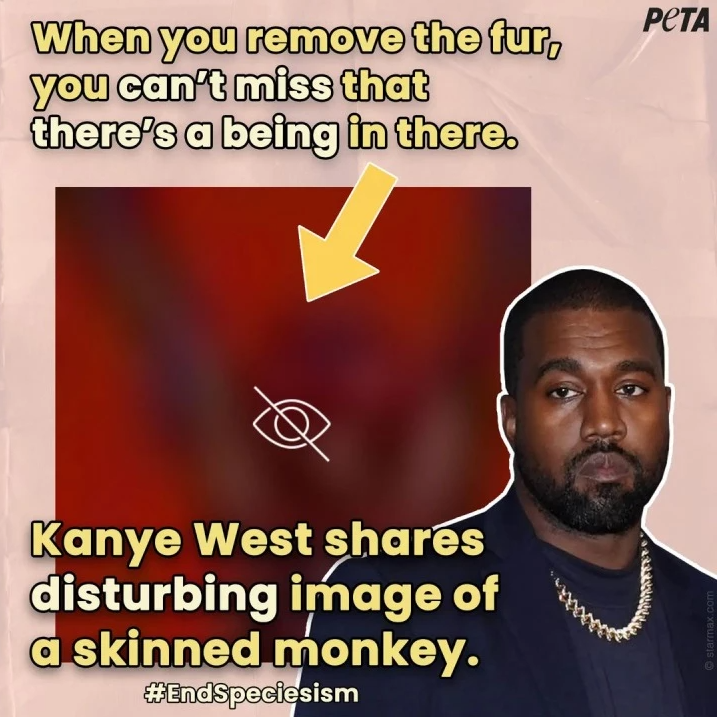 이에 미국 동물권 단체 PETA는 공식 인스타그램에 “카니예가 게재한 가죽이 벗겨진 원숭이 사진은 인간과 다른 도움 사이에 실질적인 차이가 없다는 것을 상기시켜준다.”는 글을 게재했다.