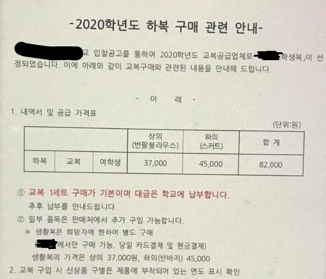 글에 따르면 현재 학교에 재학 중인 학생들은 8만 2천 원을 내면 교복 한 벌을 구입할 수 있다. 지정 판매 장소에서 반팔 블라우스는 3만 7천 원, 하의는 4만 5천 원에 판매하고 있다.