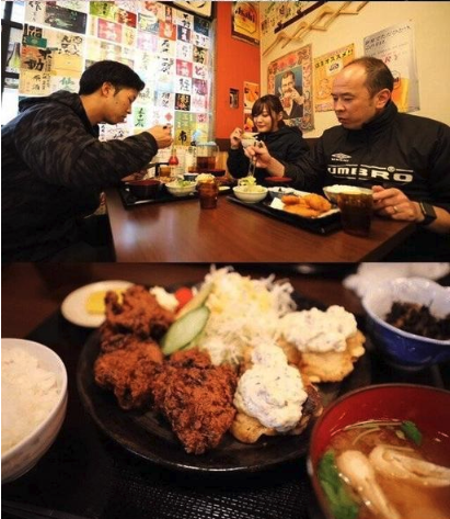 오전 11시 30분이 되고나서 함께 일하는 동료들과 돈까스 혹은 치킨 가라아게 정식 등을 먹는다. (한국으로 치면 백반집)