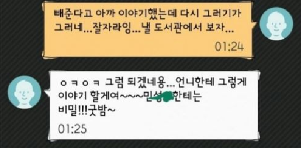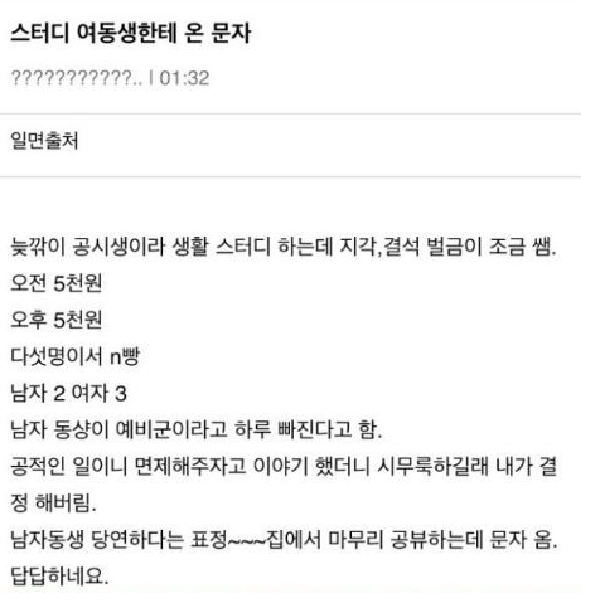 과거 한 온라인 커뮤니티에는 “스터디 여동생한테 온 문자”라는 제목의 글이 올라왔다. 남성 A씨는 공무원을 준비하면서 생활 스터디를 시작했다. 그는 “지각, 결석 벌금이 조금 쎄다. 오전 5천 원, 오후 5천 원이다”며 “남자 동생이 예비군이라고 하루 빠진다고 하길래 공적인 일이니 벌금 면제해주자고 먼저 제안했다”고 설명했다.