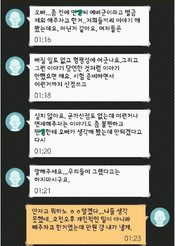 여동생은 “오빠 좀 전에 예비군이라고 벌금 제외해주자고 한거 이야기해봤는데 아닌 것 같다”고 말했다. 이어 “여자들은 빠질 일도 없고 형평성에 어긋난다. 시험 준비하면서 이런 거까지 신경 쓰고 싶지 않다”고 전했다.