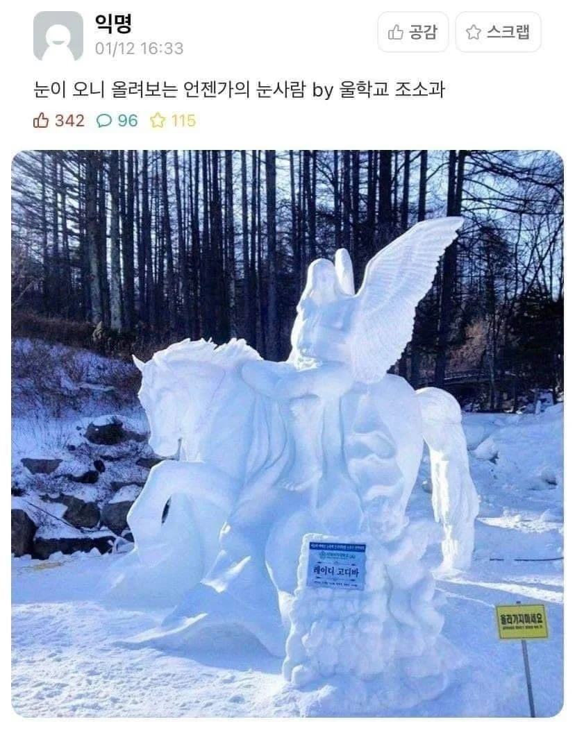 과거 에브리타임에는 “눈이 오니 올려보는 언젠가의 눈사람 by 울학교 조소과”라는 내용의 글이 올라왔다.