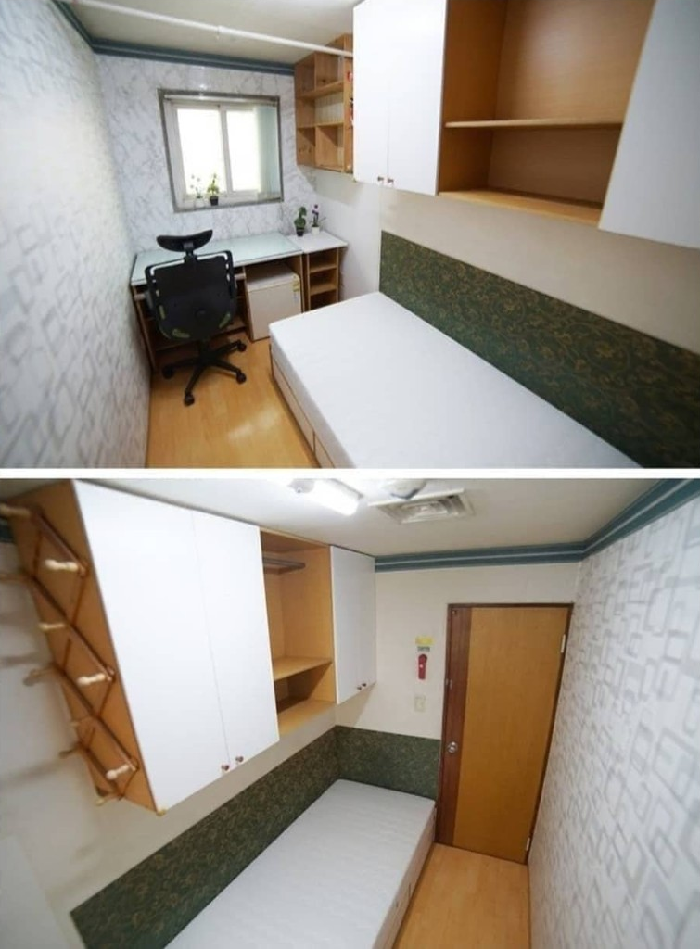 2평 고시원에는 책상과 의자, 침대를 놓고 나면 사람이 걸어 다닐 공간만 남는다. 그러나 방 안에 화장실과 부엌이 없다는 점이 단점이다.