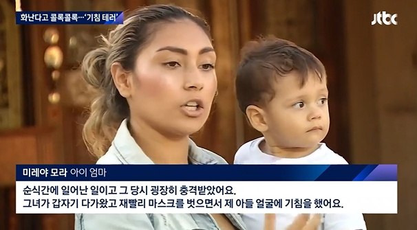 화가 난 백인 여성은갑자기 마스크를 벗어 아기 얼굴에 대고 기침을 반복했다.