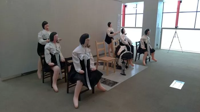 이후 남성은 단발머리에 흰 저고리, 검정 치마 차림의 풍선 인형들 사이에 앉아 인형에 바람을 불어 넣는 퍼포먼스를 펼쳤는데, 남성이 쓰러져 있던 인형에 공기 주입기로 바람을 불어넣자 축 처져 있던 인형은 서서히 일어났다.