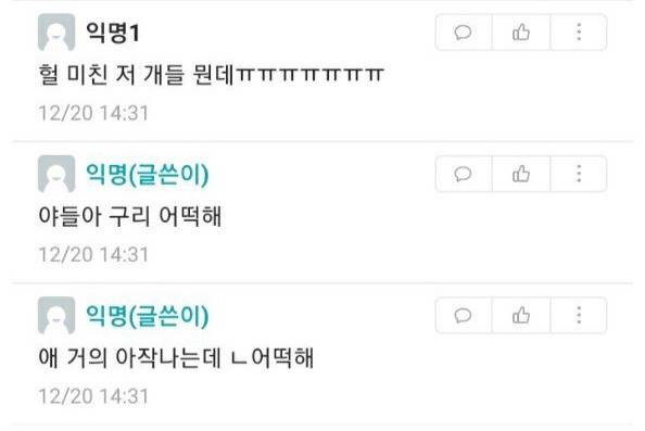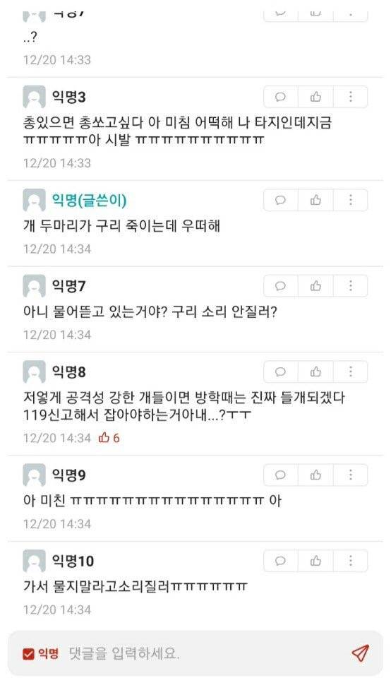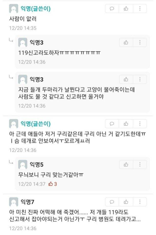 이어 “(돌을 던져도) 도망가지 않는다. 구리 죽을 것같다. 개 두 마리가 죽이는데 너무 커서 다가가질 못하고 있다”고 덧붙였다.