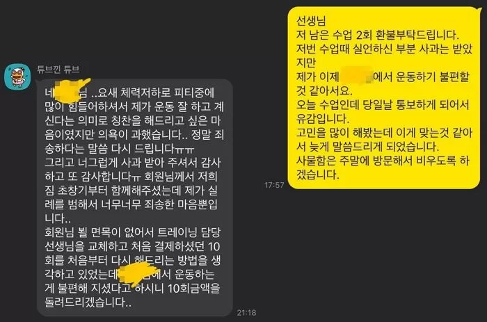 결국 고심 끝에 환불을 결심한 A씨는 트레이너에게 남아있던 PT 2회가량분을 환불해 달라고 요청했다.