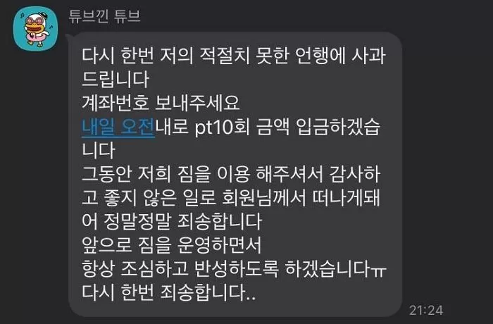 트레이너는 A씨에게 “10회 금액을 돌려주겠다”며 “항상 조심하고 반성하도록 하겠다”는 말을 건넸다.