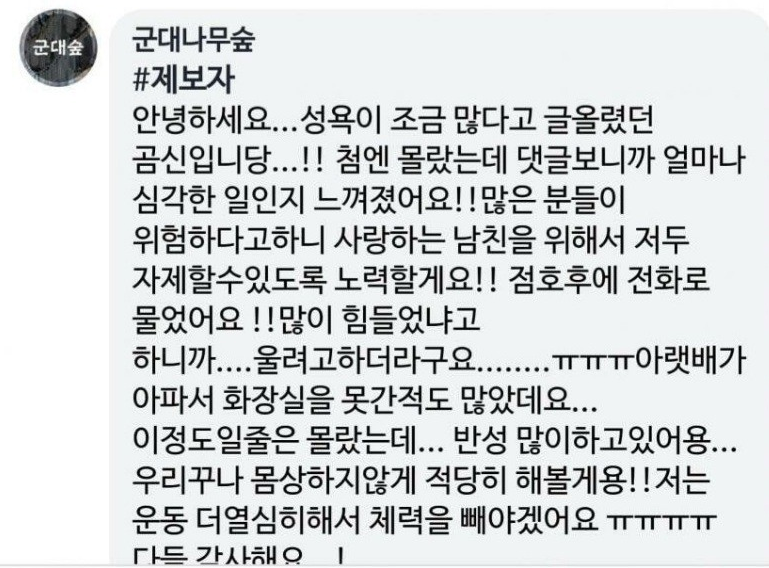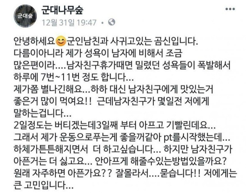 최근 페이스북 ‘군대나무숲’에는 군인 남자친구를 만나고 있는 여성 A 씨가 직접 작성한 글이 올라왔는데, A 씨는 “내가 성욕이 남자에 비해서 조금 더 많은 편이다. 남자친구 휴가 때면 밀렸던 성욕이 폭발해서 하루에 7~11번을 한다”고 밝혔다.