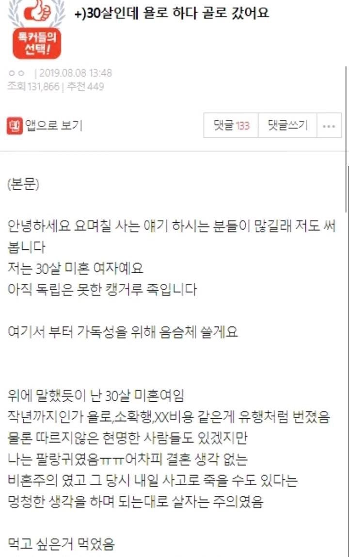 지난 8일 한 온라인 커뮤니티에는 ’30살인데 욜로 하다 골로 갔어요’라는 글이 올라왔다.