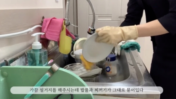 영상에서 A 씨는 밥을 하고 콩나물국을 끓였고, 식사가 끝난 후 설거지 역시 A 씨의 몫이었다.