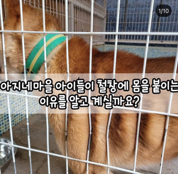 경기 김포의 유기견 보호소 ‘아지네마을’ 인스타그램에는 “아지네마을 아이들이 철창에 몸을 붙이는 이유를 알고 계실까요?”라는 문구와 사진을 여러 장 게시했다.