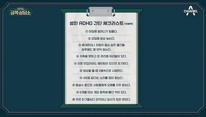 이어 ‘모임에 항상 늦는다’, ‘휴대폰이나 자동차 열쇠 같은 물건을 하루에도 몇 번씩 찾는다’, ‘저축을 못하고 돈 관리에 어려움이 있다’, ‘유명 맛집이어도 웨이팅이 있으면 포기한다’ 등이 성인 ADHD 체크리스트 항목에 있었다.