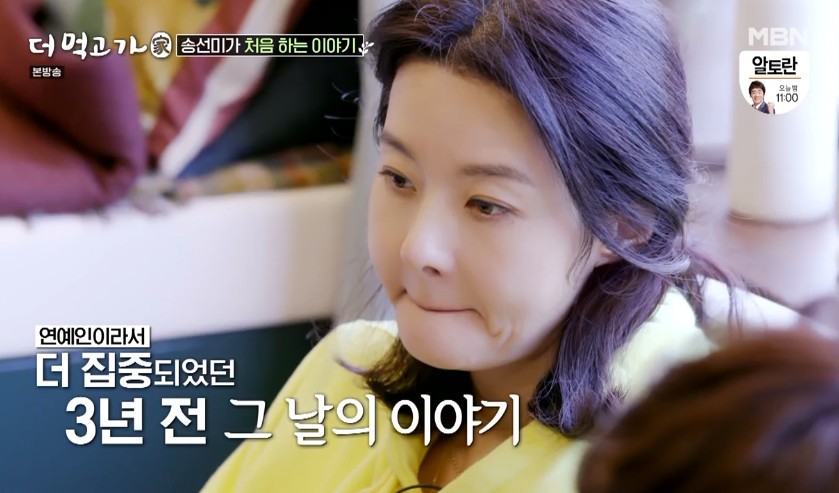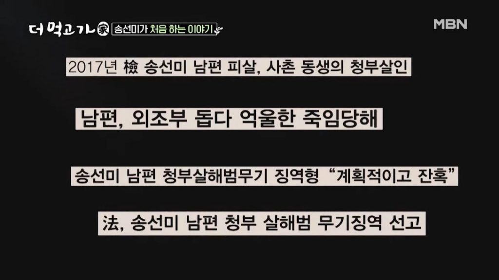 송선미는 과거 방송된 MBN ‘더 먹고 가’에 출연해 지난 2017년 피살된 남편 얘기를 꺼내다가 남편을 그리워 하며 눈물을 흘렸다.