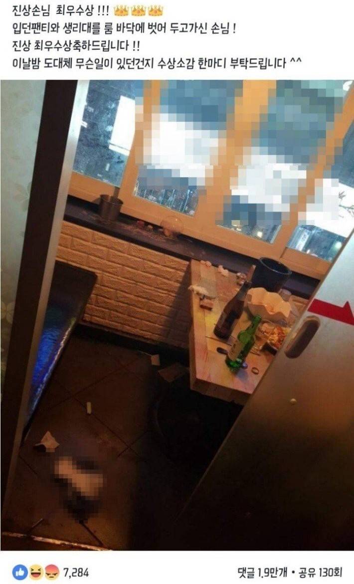 사진과 글을 보니 한 진상 여손님이 입던속옷과 생리대를 룸 바닥에 버려둔채로 떠났다고 한다.