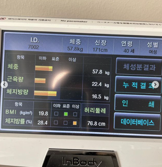 인바디 검사 결과 그의 신장은 171cm, 몸무게는 57.8kg였다. 표준 몸무게를 유지하고 있었지만 체지방률은 28.4%로 조금 높은 수준을 보였다.