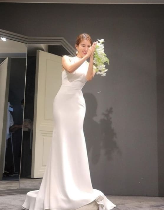 지수는 결혼식 사진도 공개했는데, 공개된 사진에서 지수는 웨딩 드레스를 입은 채 미소를 짓고 있었다.