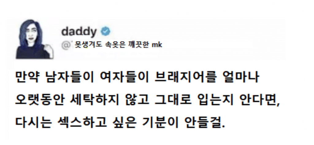 해당 작성자는 “만약 남자들이 여자들이 브.래.지.어를 얼마나 오랫동안 세탁하지 않고 그대로 입는지 안다면, 다시는 젝스하고 싶은 기분이 안들걸.”