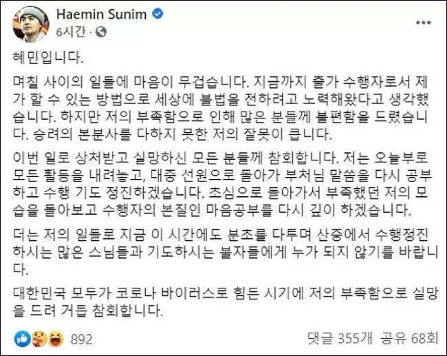 또한 “상처 받으신 모든 분들께 참회한다”라고 말하며 “오늘부로 모든 활동을 내려놓고 부처님 말씀을 다시 공부하고 수행 기도 정진하며 초심으로 돌아가서 부족했던 저의 모습을 돌아보고 수행자의 본질인 마음공부를 다시 깊이 하겠습니다”라고 알렸다.