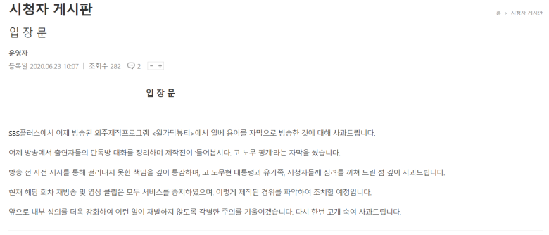 이어 매체 인터뷰를 통해 “해당 프로그램은 외주 제작을 맡기고 있으며, SBS플러스는 방영권만 가지고 있는 상황”이라 해명했다.