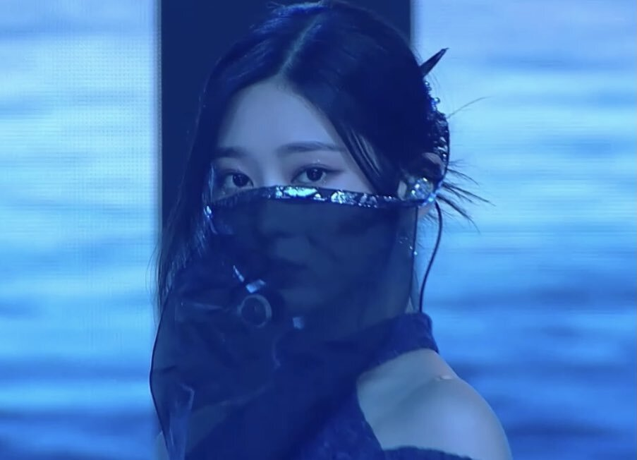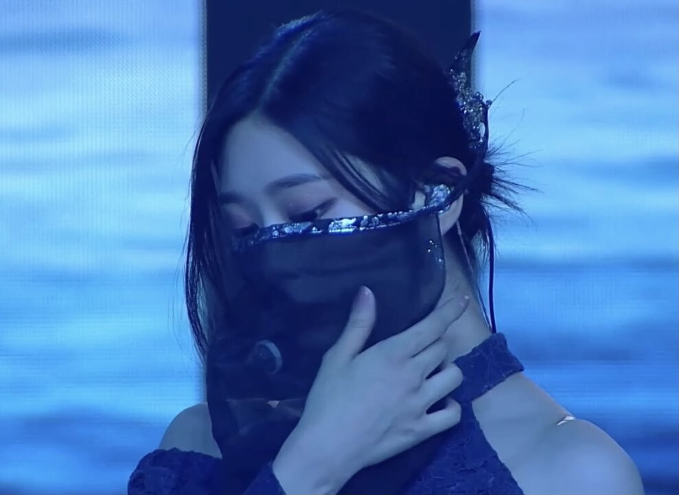 얼굴을 가리는 마스크를 쓰고 등장한 김민주는, 무대 중간에 벗어던지는 퍼포먼스를 진행했다.