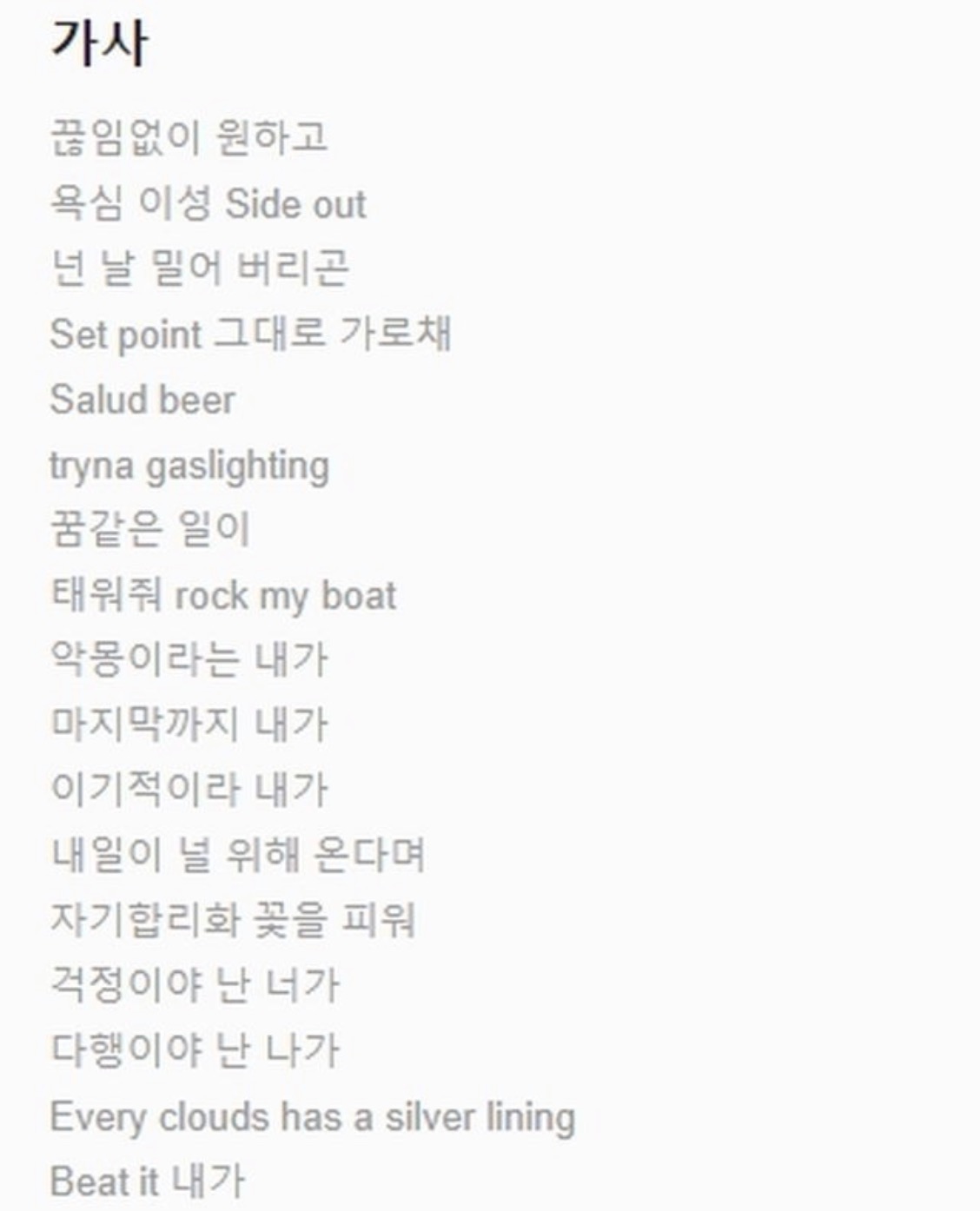 ‘도도’의 가사를 보면 ‘끊임없이 원하고/욕심 이성 Side out/넌 날 밀어 버리곤/Set point 그대로 가로채/Tryna Gaslighting(상황을 조작해 타인을 통제하는 행위)/이기적이라 내가/내일이 널 위해 온다며/자기합리화 꽃을 피워/걱정이야 난 너가/다행이야 난 니가’ 등의 가사로 채워져 있다.