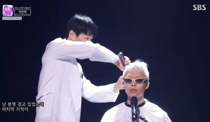 노래가 시작하자 남성은 이찬혁의 목에 미용 가운을 둘렀고, 이찬혁의 머리카락을 망설임 없이 밀었다.