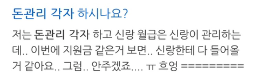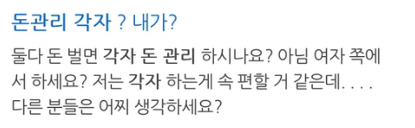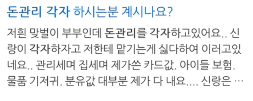 A씨는 “맞벌이일 경우 생활비 얼마씩 따로 각출하고” 라 말문을 열었다.