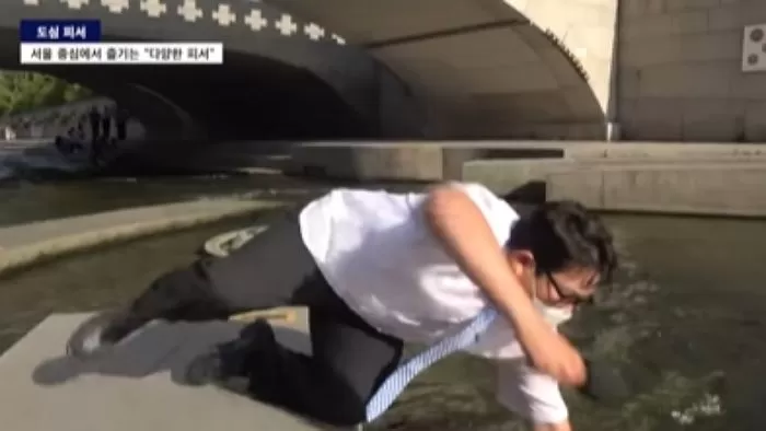 이어 리포터가 청계천 물에 손을 담그며 “전문가들은 실제로 물에 발을 담그는 것만으로도 약 3도간의…”라고 말하던 도중 발을 헛디뎌 물에 빠져버렸다.