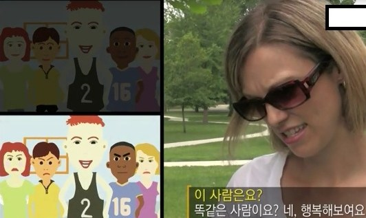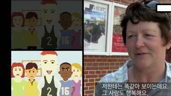 동양인은 아래의 사진에서 주위 사람들이 표정이 좋지 않으면 행복해 보이지 않는다는 대답을 했다.