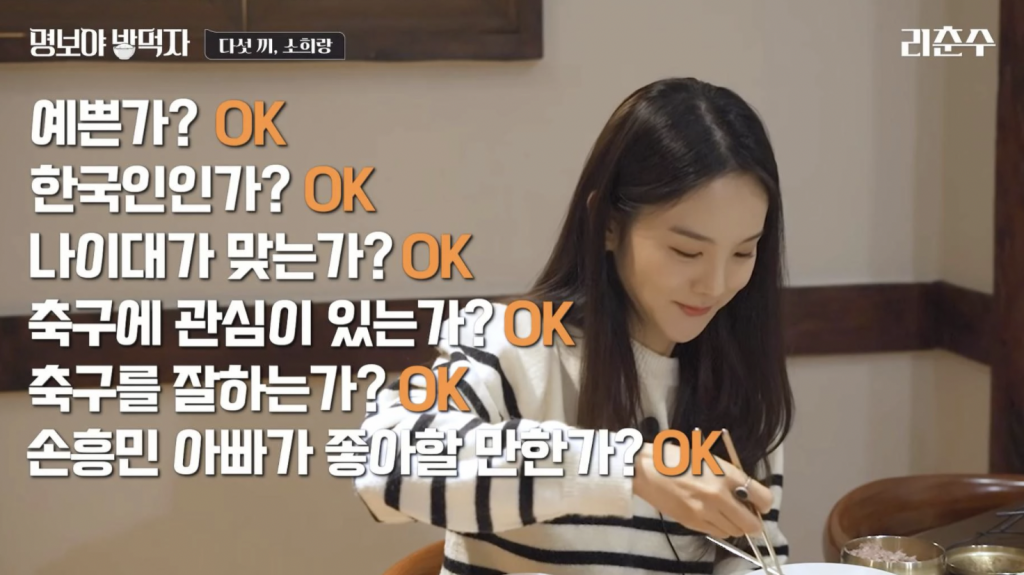 송소희가 부끄러워 하는 모습을 보이자 이천수는 “이유가 있다. 예쁜가? 오케이. 한국인인가? 오케이. 나이대가 맞는가? 오케이. 축구에 관심이 있는가? 오케이. 축구를 잘하는가? 오케이. 손흥민 아빠가 좋아할 만한가? 오케이.”라며 설명했다.