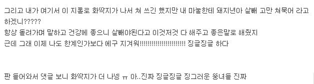 본문은 연속해서 추가글을 작성하였고 그 내용의 일부를 살펴 보면 “너네들이 뚱 뚱띠 개뚱띠 개뚱돼지가 된데는 다 이유가 있는거야 이 뚱들아 제발 탓좀 하지말어라”, “자꾸만 말 말투 막말 가지고 뭐라하는데 내가 내 돼지마눌한테 여기 글처럼 막말 하겠니?????? 그래 내가 찌질해서 대놓고 못하고 여기다 화풀이 하는건 알겠느데너네 뚱띠들 디게 웃기는거는 알지??” 등 뚱뚱한 여자를 비하하는 듯한 글이 전체 내용을 차지 하고 있었다.