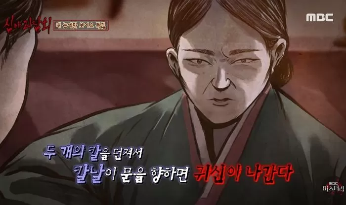 현우가 어떻게 해야하냐고 물었고, 그녀는 식칼 두 개를 던져서 칼날이 모두 문쪽을 향하면 귀신이 나갈 거라 전했다.