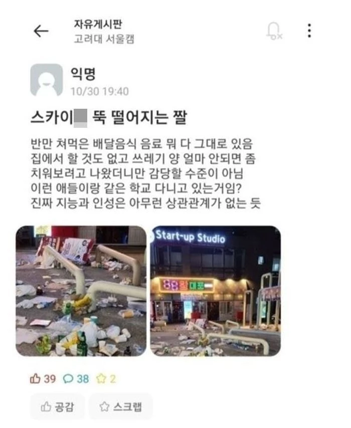 공개한 사진에서 고려대학교 한 익명의 학생은 지난달 30일 오후 7시 40분에 ‘스카이 자부심 뚝 떨어지는 짤’이라는 제목의 글을 올리며 “반만 먹은 배달 음식, 음료 다 그대로 있다. 좀 치워보려고 나왔는데 감당할 수준이 아니다. 이런 애들이랑 같은 학교 다니고 있는 거냐. 지능과 인성은 아무런 상관관계가 없는 듯”이라며 고려대 인근 광장의 길거리 사진을 업로드했다.