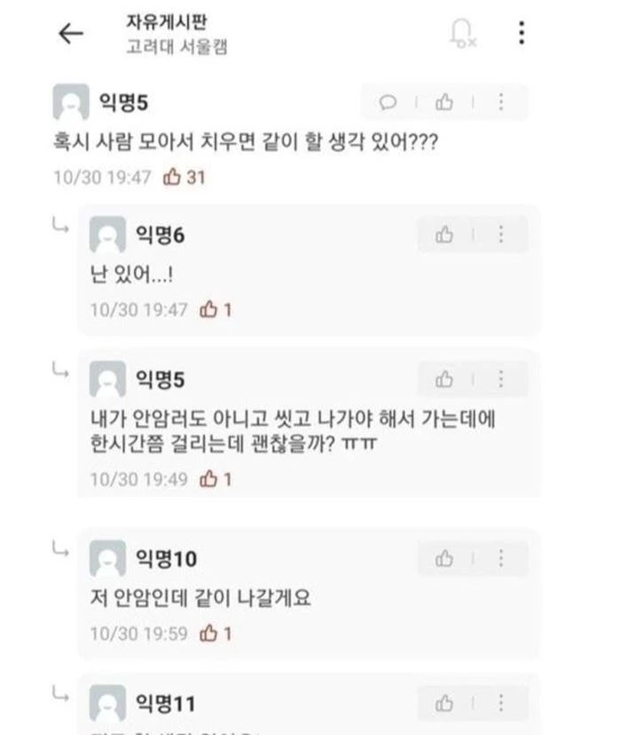 그러자 약 7분 뒤 또 다른 고려대학교 학생이 “혹시 사람 모아서 치우면 같이 할 생각 있느냐”라고 물었고, 해당 게시물에는 많은 학생이 동참하겠다는 의사를 표현한 댓글을 남겼다.