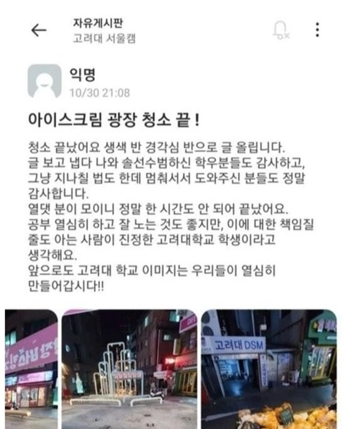 한 익명의 학생은 이날 오후 9시쯤 “청소 끝났다. 생색 반 경각심 반으로 글 올린다. 글 보고 냅다 나와 솔선수범하신 학우분들도 감사하고 그냥 지나칠 법도 한데 멈춰서서 도와주신 분들도 감사하다.