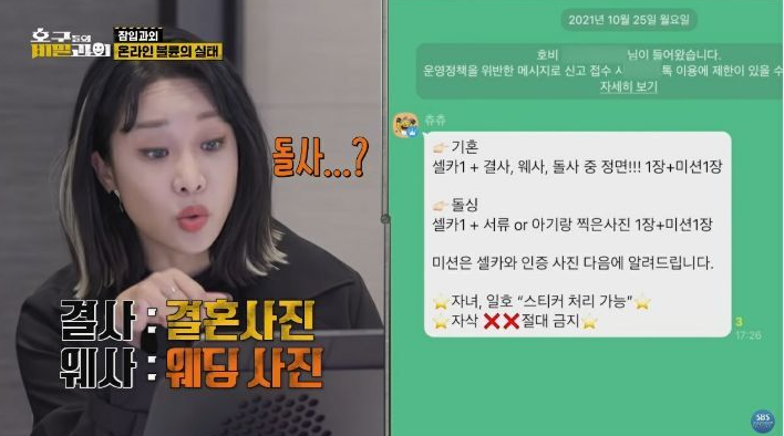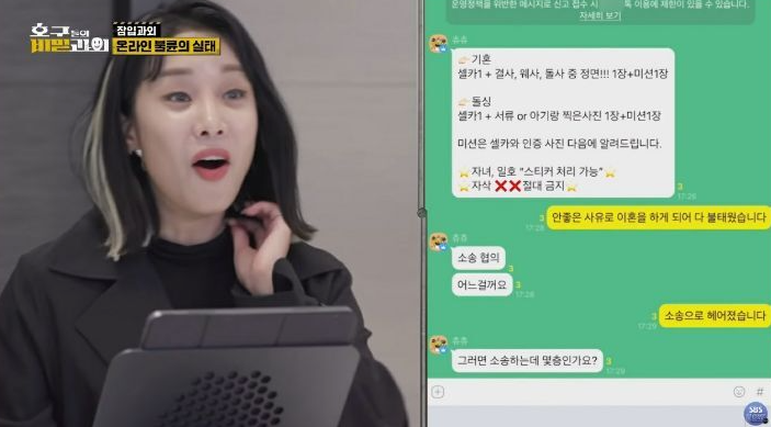 이어 제작진이 “안 좋은 이유로 이혼을 해서 다 불태웠다”고 하자, 채팅방 운영자는 실제 이혼한 사람인지 확인하려고 이혼 절차에 대한 세세한 질문을 던졌다.