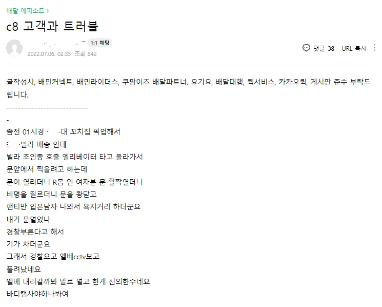 정황상 고객이 A씨에게 음식물을 문 앞에 두고 가라고 했고, 기사가 간 줄 알고 바로 문 앞으로 나왔다가 이런 사태가 생긴 것으로 보인다.
