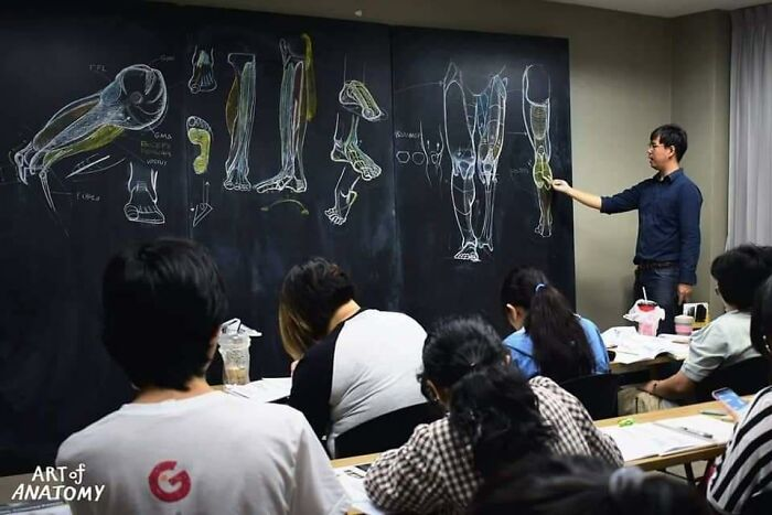 단지 칠판 위에서 그림을 알려주는 것이 아니라, 실제 인간의 몸에서 근육을 파악해 그림을 그리는 법을 가르친다.