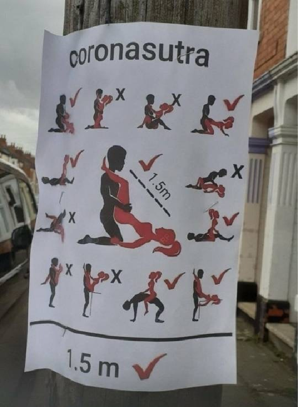 종이에 그려진 13가지 자세 중 1.5m 간격을 둔 것은 7개뿐이다. 왼쪽에 그려진 그림과 같이 연인과 1.5m 간격을 둬야 한다. 코로나19의 빠른 확산에 커플들도 조심해야 한다는 의미를 담은 것으로 보인다.