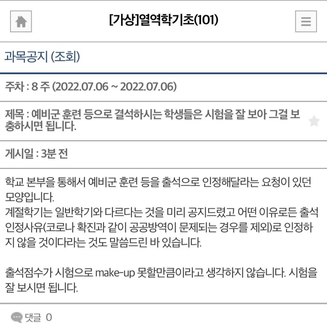 논란이 확산하자 A교수는 추가 공지를 통해 “예비군 훈련 출석으로 인정하겠다”고 정정했다.