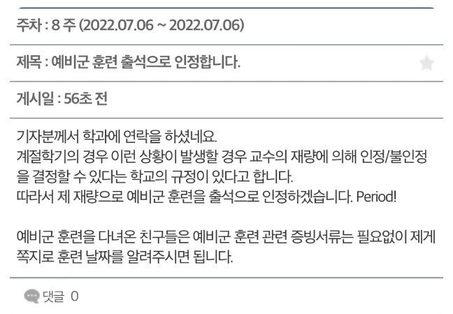그러면서 “따라서 제 재량으로 예비군 훈련을 출석으로 인정하겠다”며 “예비군 훈련을 다녀온 친구들은 훈련 관련 증빙서류는 필요 없이 쪽지로 훈련 날짜를 알려주면 된다”고 공시했다.