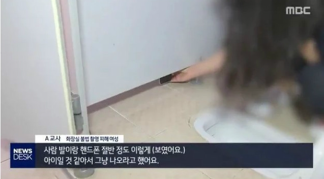피해 여성인 A교사는 “회의하다가 저만 혼자 화장실에 오는 상황이었어요. 개학 전날이라 학생도 없었어요. 화장실 들어갔는데 옆에서 덜컹 소리가 났어요. 볼일 보는데 한 번 더 인기척이 나더라고요”라고 당시 상황을 설명했다.